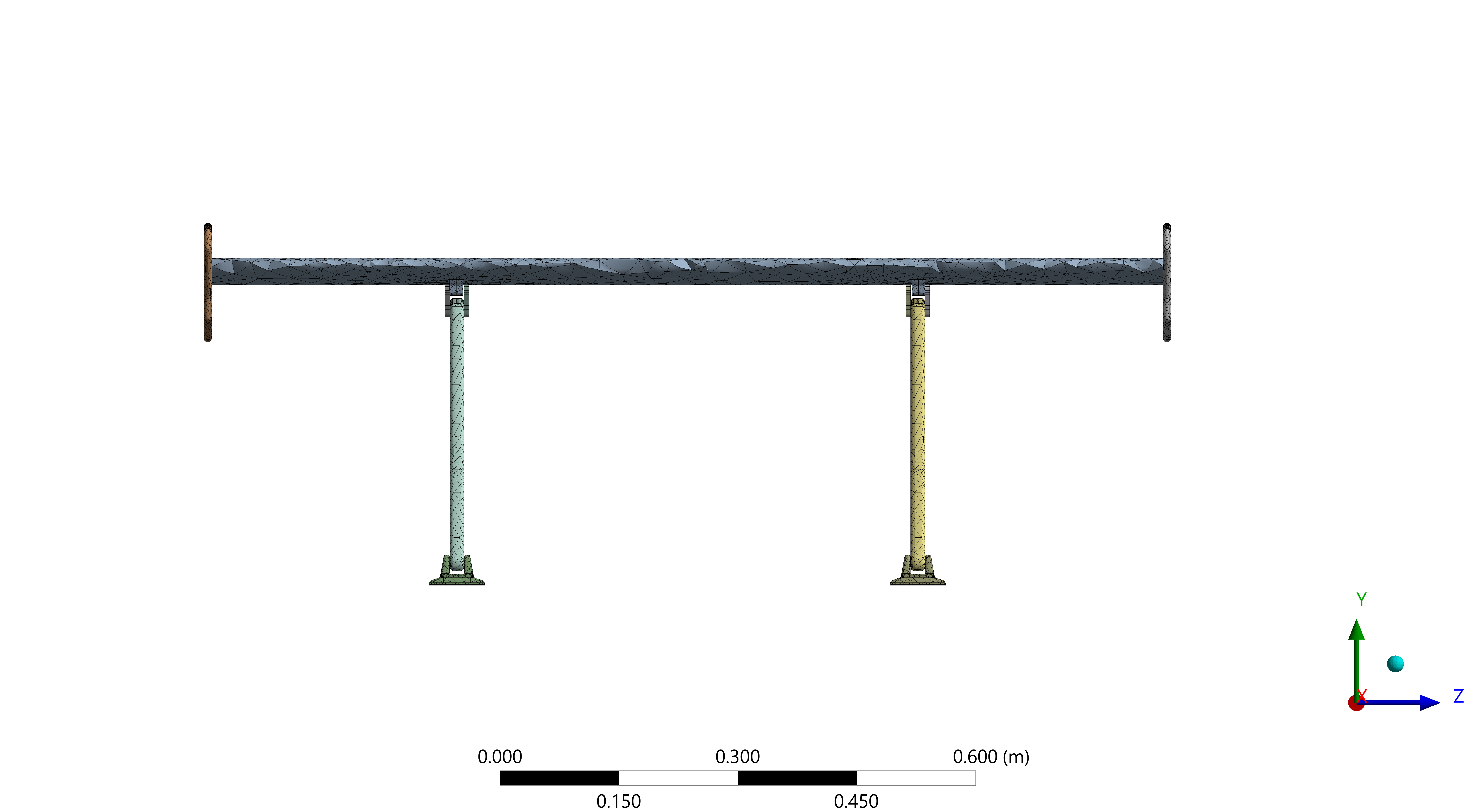 Modal analysis determines the natural frequencies and corresponding mode shapes of a structure in the absence of external damping. We compute undamped eigenfrequencies and mode shapes to compare materials on a consistent basis and to assess separation from a 30 Hz target. For light damping typical of metals, polymers, and CFRP laminates (order of a few percent of critical), the frequency shift is on the order of 10−3 relative (negligible for ranking and threshold checks). Damping chiefly governs response amplitudes near resonance rather than the eigenfrequencies themselves. Because we do not perform a forced-response analysis here, omitting damping avoids introducing uncertain estimates for joint, material, and interface losses without affecting the conclusions about mode placement or stiffness com- parisons21,22,23,24,25. Each natural frequency represents a resonant condition at which the structure can oscillate with minimal input energy. Knowledge of these frequencies is critical because if operational or environmental excitation coincides with a natural frequency, dynamic amplification and potentially catastrophic fatigue can occur. A modal analysis solver is used to compute the first six fundamental frequencies. Key outputs collected include natural frequencies and mode shapes with qualitative deformation patterns.