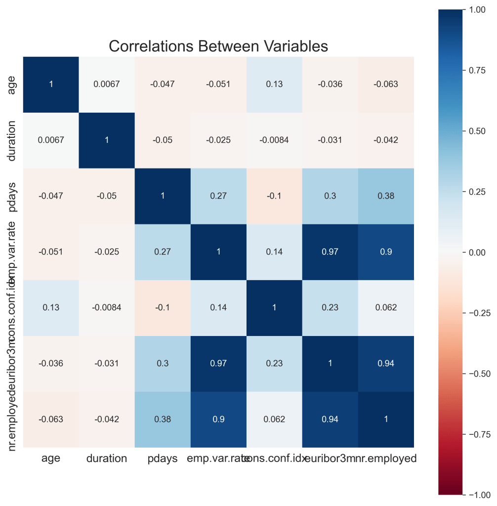 Figure 2 shows the heat map of the correlation between variables. The squares that are dark blue represent a significant correlation between the variables that it represents while a dark red signifies a strong negative correlation. The lighter squares represent a lack of correlation between the variables it represents. When looking at the data, we can see that there is a significant correlation between emp.var.rate and euribor3m with a score of 0.97. This shows that the data in each variable is extremely similar, allowing us to potentially remove one or the other while keeping similar results in the model due to how interchangeable they are. The correlated pairs with a score of above 0.8 as shown by this were emp.var.rate and euribor3m with a score of 0.969, emp.var.rate and nr.employed with 0.899, and euribro3m with nr.employed with a score of 0.944.