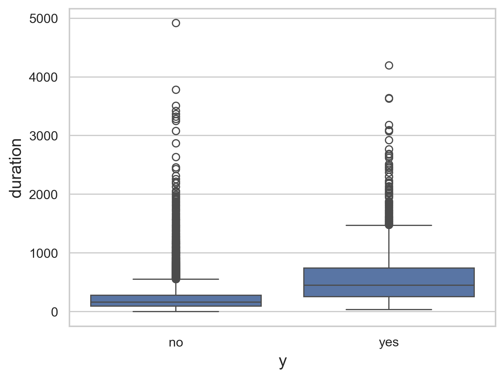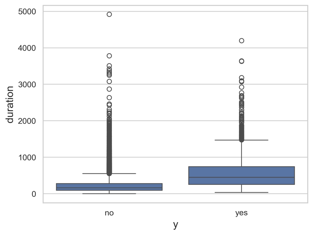 Figure 3 demonstrates the outcomes on the x-axis to the duration on the y-axis. This allows us to get a better understanding of how the two correlate as we can see durations with the highest chance of success, along with the highest chance of failure. We can see this as the blue box represents the greatest concentration of values for the duration and the box for the successful campaign being greater than the failing campaign shows how with a higher duration, there is a greater likelihood that the consumer will buy the product.