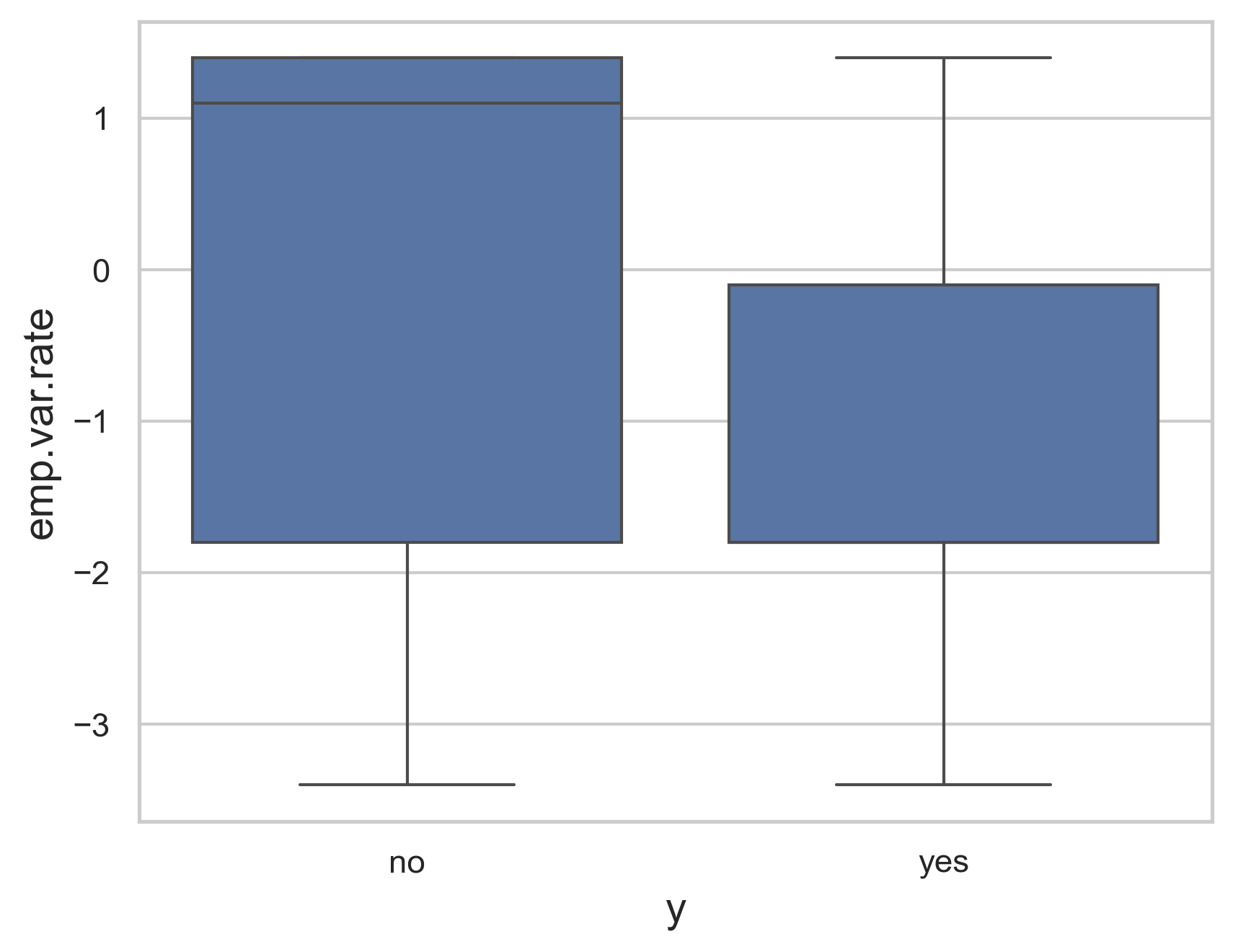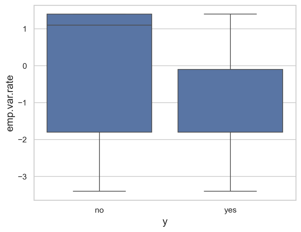 Figure 4 below is another box plot that shows the greatest concentrations of the employment variation rate in terms of which ones succeeded and which failed. The successes have a significantly clearer range of around 0 to -2 while the failures are much more spread out with 1.5 to -2. Using this knowledge, we can determine that the highest values of the emp.var.rate feature will result in a failure while lower values at around -1 on average will result in the best chance of a successful campaign.
