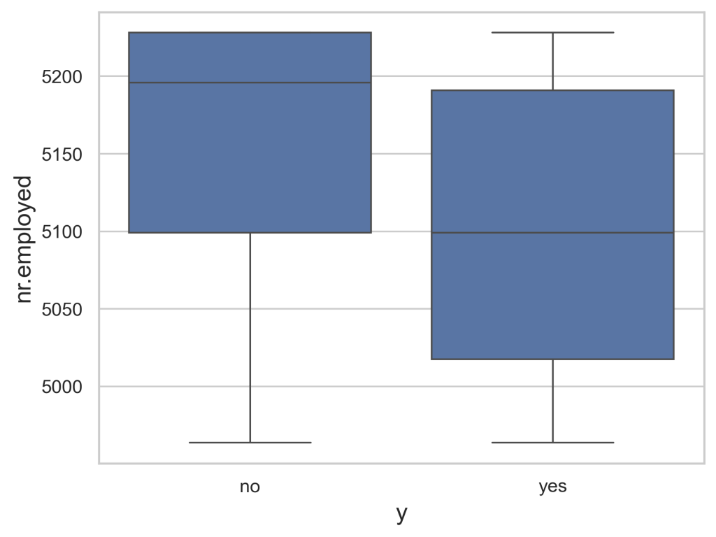 Figure 5 demonstrates the relationship between nr.employed with the outcome. The successes have a very broad range of around 5180 to 5025, while the failures are much more concentrated around 5225 to 5100. From this, we can tell that any value of nr.employed that is greater than 5180 while have a significantly greater chance of failing rather than succeeding, whereas numbers between 5100 and 5025 while have a higher chance of succeeding. Between the values of 5180 and 5100 however, there isn’t a clear outcome with both outcomes having a decent chance of occurring.