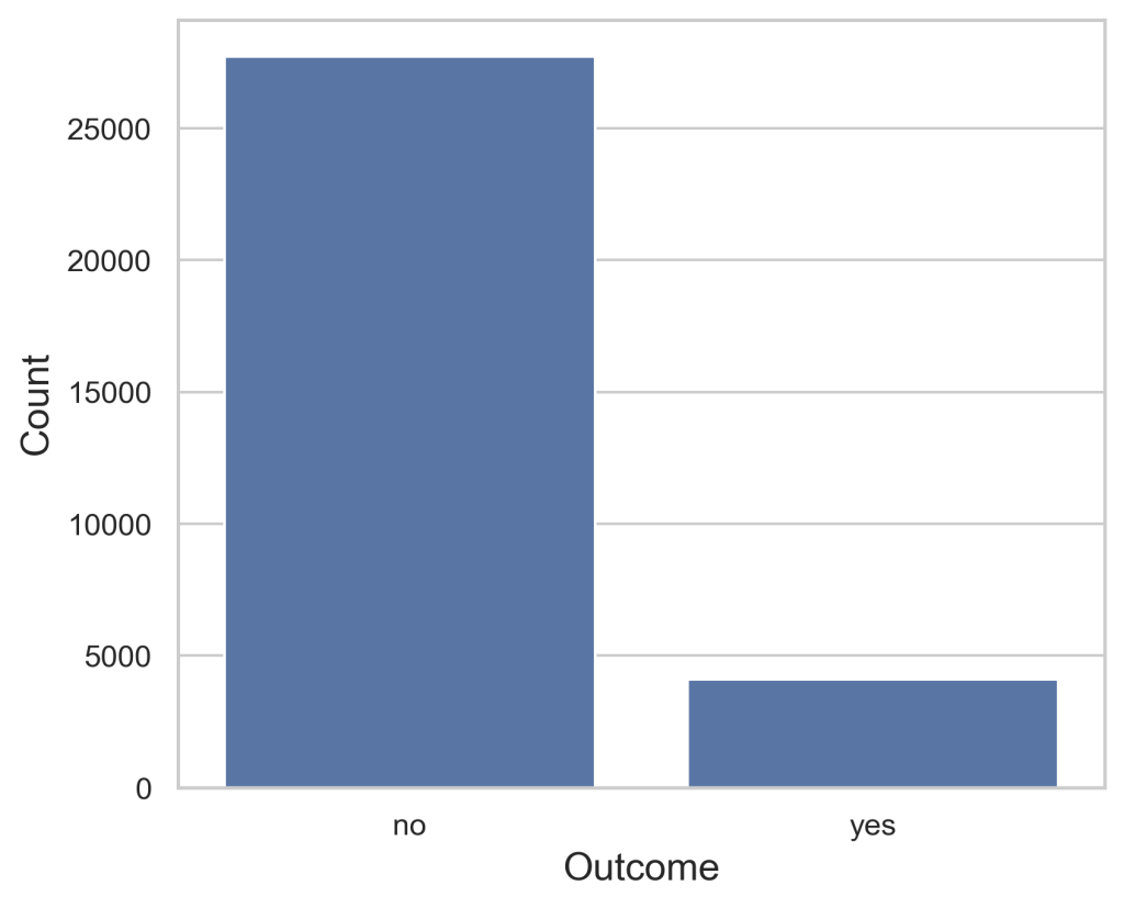 Figure 1 illustrates the count distribution of a successful (yes) or failed (no) telemarketing outcome. The failures have over 27,727 representations in the dataset while the successes had 4,101. The substantial difference in the count between them demonstrates how the data is greatly imbalanced toward the failure side.