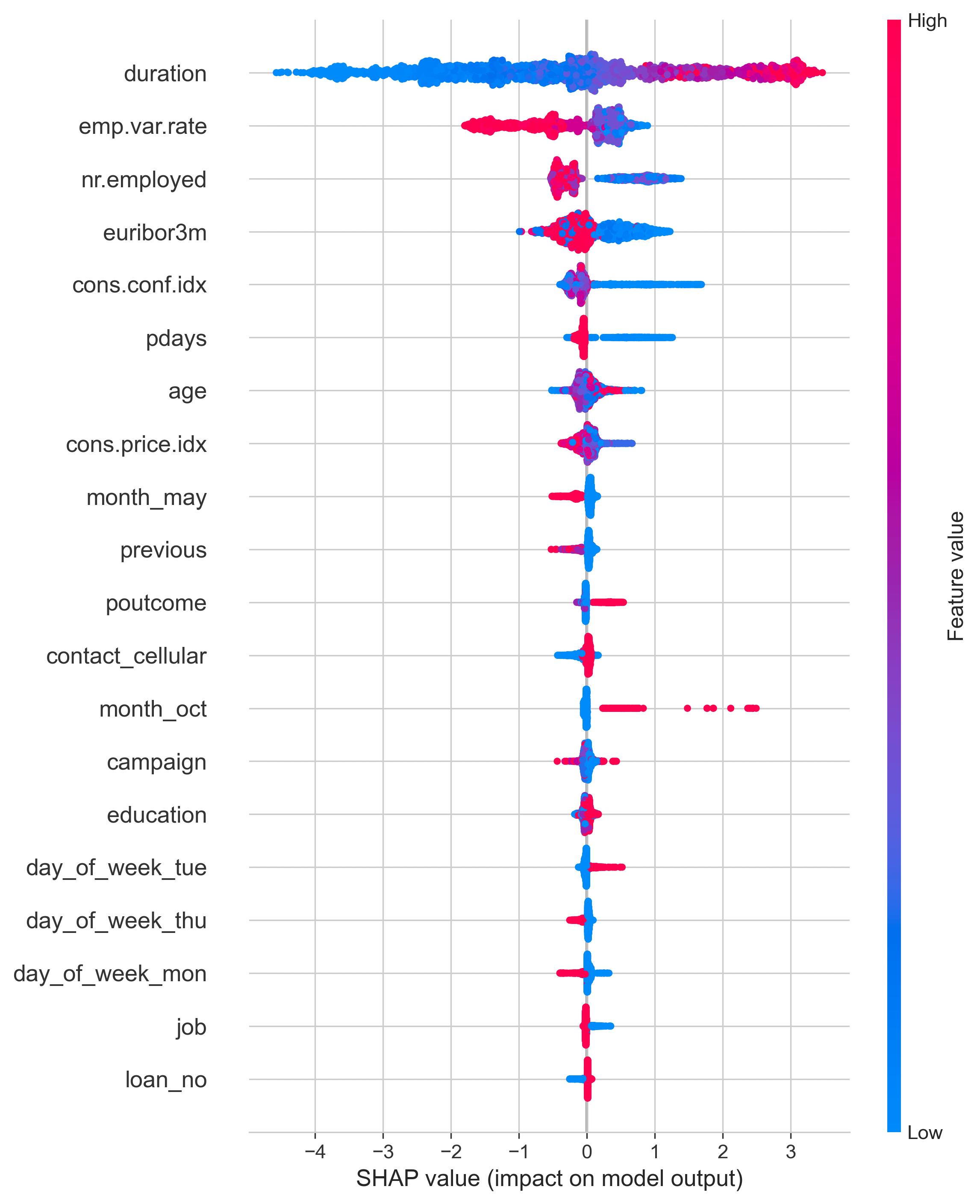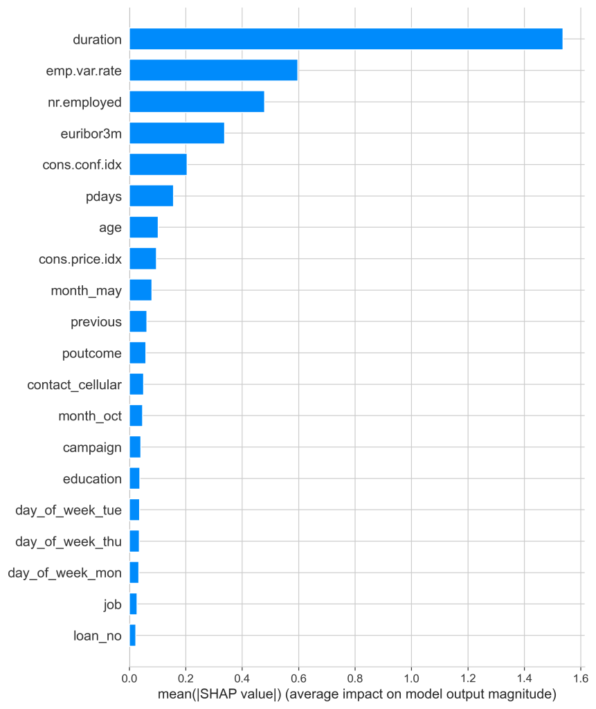 Figure 10 displayed the columns ranked by their mean SHAP values. In this, duration clearly came out on top with emp.var.rate, nr.employed, euribor3m, and cons.conf.idx trailing behind it. Duration had a mean value of around 1.5 making it clearly the most impactful column with the next variable having only a score of 0.6, showing that it still is impactful, but duration is by far the most useful for outcome prediction.
