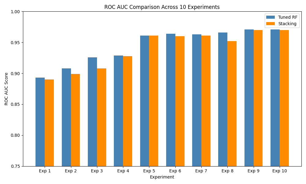 To test robustness, I repeated all experiments with 10 random train/test splits using different seeds. Table 2 summarizes the test ROC AUC for both Random Forest and the stacking ensemble. Figure 3 visualizes AUC variability across splits, highlighting the stacking model’s consistent advantage.