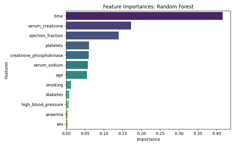 Feature-importance analysis confirmed ejection fraction and serum creatinine as top predictors, reinforcing prior clinical literature. The time variable—initially ranked high—was excluded from final models due to its direct correlation with survival duration, raising label leakage concerns. Removing this variable strengthens methodological soundness and improves real-world applicability.