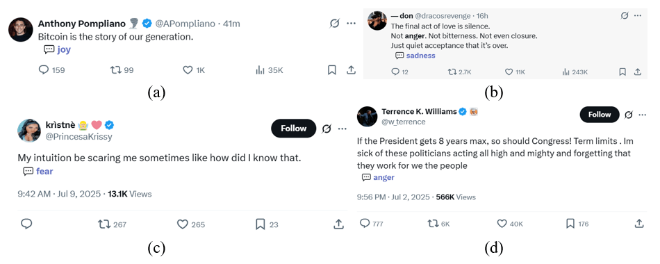 Research in natural language processing has explored supervised learning for sentiment analysis and classified tweets into positive, negative, and neutral categories. These studies typically use well-established supervised models such as Support Vector Machine (SVM)1 and Long Short-Term Memory (LSTM)2,3. More advanced supervised learning algorithms have expanded the categories to include emotions such as joy, anger, fear, and sadness. Ameer et al. introduced transformer networks along with multiple attention mechanisms4 to detect and classify emotions with multiple labels. Mohammad and Bravo-Marquez were able to not only classify multiple emotions of tweets but also detect the intensity of those emotions5. These supervised methods usually require a large pre-labeled dataset. Demszky et al. introduced the GoEmotions dataset6, covering 27 emotion categories. The emotion classification work is often organized based on psychological frameworks such as Plutchik’s wheel of emotions7, which organizes emotions into eight primary categories, and Russell’s circumplex model8, which presents emotions in continuous valences and arousal spectrums. These models provide machine learning with the background knowledge about basic emotions and quantify psychological processes that the machine is trying to study. However, these supervised approaches are inherently limited by their heavy dependence on labeled data and lack of cross-domain adaptability.