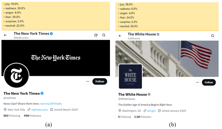 The proposed algorithm was successfully integrated into Google Chrome as an extension. When the user visits the X.com page, tweets are automatically analyzed using the TF-IDF plus K-Means module via JavaScript code. It extracts tweet contents in real-time, computes vectors, performs clustering, and then maps each cluster back onto an approximate emotional category through the process explained in Methods. Tests demonstrate that this labeling operates with minimal delay and provides the user with a sense of the sentiments of Twitter accounts. The resulting Chrome Extension program allows its users to see the emotion label of each tweet on the page and the percentage breakdown of the 60 most recent tweets made by a profile when the user clicks into it. Some screenshots of the model’s emotion labels of tweets are shown in Figure 19. Some screenshots of the model’s evaluation of a profile’s emotions based on recent tweets are shown in Figure 20.
