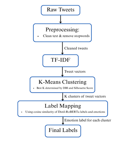 Overall, previous unsupervised methods have the following limitations. First, many unsupervised methods perform less powerfully when they cluster tweets into three or more clusters. Nuanced emotions are not represented effectively. In this paper, the proposed method uses TF-IDF and DistilRoBERTa to capture more details and map emotions more neatly. Second, some approaches are often not well-adjusted to the online environment and cannot be easily implemented in real time. Hence, K-Means is selected as a computationally light and generalizable alternative.