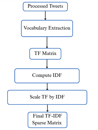 After data preprocessing by cleansing the unnecessary information, the Term Frequency-Inverse Document Frequency (TF-IDF) algorithm21,22 is used. This converts each tweet into a numerical vector that represents its semantic composition. TF-IDF tokenizes the data and assigns values based on the content and importance of the words. Hence, the vectors produced are sparse and weighted. This makes the data suitable for distance-based clustering of the vectors. Clustering assumes that the closer together two vectors are, the more similar the semantic information being represented is. The TF-IDF vectorizer process is summarized in Figure 6.