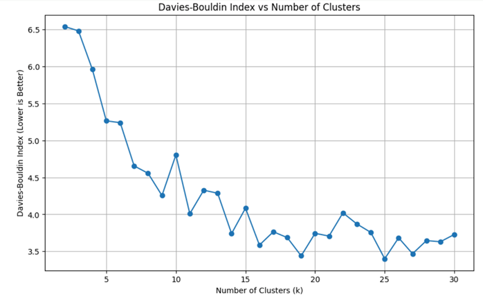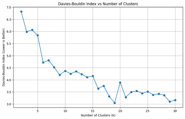 After applying TF-IDF vectorization on the 16,000-tweet dataset, the K-Means algorithm is implemented with different scenarios (splitting the dataset into 2 to 30 clusters), and their respective DBI score results against cluster numbers K are plotted in Figure 7. The candidate cluster number range is chosen from 2 to 30, as it aligns with psychological models suggesting that human emotions can be classified into up to 27 categories26.