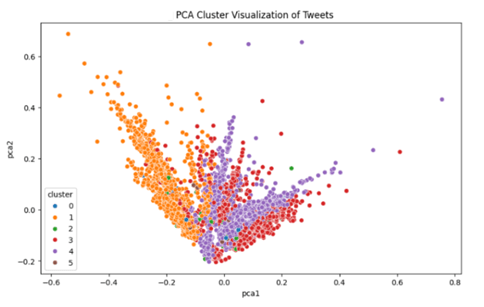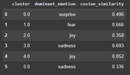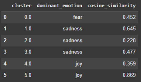 Of the 6 clusters, clusters 1, 3, and 4 have high cosine similarity scores, indicating that those clusters are more closely aligned with their labels of fear, sadness, and joy, respectively. Clusters 2 and 4 are both labeled as “joy,” and clusters 3 and 5 are both labeled as “sadness.” This could suggest that there are subtle differences between the “joy” expressed by tweets in cluster 2 and that expressed by tweets in cluster 4, for example.