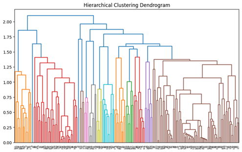 Then, a Principal Component Analysis (PCA) and a Hierarchical Clustering Dendrogram are done to visualize the six clusters. The PCA reduces the high dimensionality of the data to two axes with the most variance, PCA1 and PCA2. The hierarchical visualization is done through calculating the distance between pairs of data points and applying a merge algorithm to store and then display that information.
