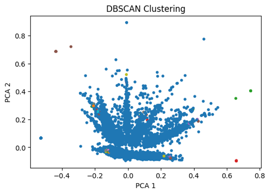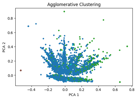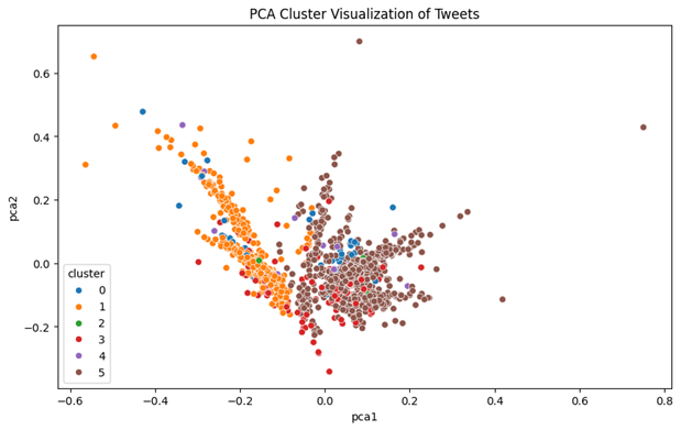 As shown in the PCA graph Figure 8, the orange cluster is packed tightly and clearly separated to the left. The purple cluster is also cohesive and has a tail shape. The red cluster is cohesive but overlaps with the purple one. The green, blue, and brown clusters overlap and are not very visible. They might capture outliers or reflect the limitation of PCA visualization in reducing high-dimensional vectors, a common problem with text-related data or complex vectors produced by TF-IDF. Overall, the PCA graph shows reasonable clustering with some structure.