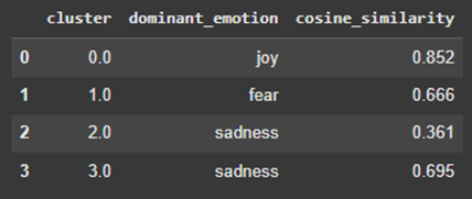 Second, the same pipeline is run on K=4 clusters instead of K=6 to test the output emotions. The cluster purity is 0.3353, which is slightly smaller than that of K=6. The resulting cluster labels and cosine similarities are displayed in Figure 18. Compared with the results in Figure 10 for K=6, while the 4-cluster method has a slightly higher average cosine similarity by 0.07 and slightly more cohesive clusters, the 6-cluster solution offers more complexity and nuance. It preserves the core clustering of the 4-cluster method, such as a strong joy cluster and a strong sadness cluster, indicating that the 6-cluster solution concurs with the overall classification of emotions. A higher K value might sacrifice cohesion marginally, but it compensates by potentially revealing subcategories within each broad sentiment label.