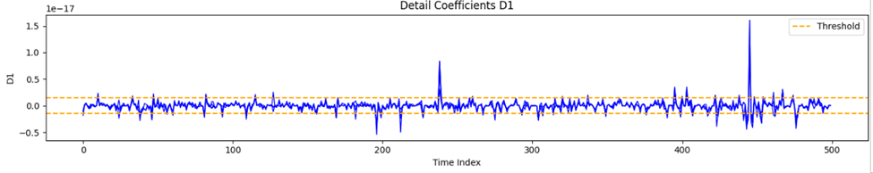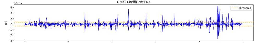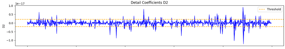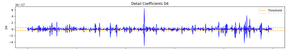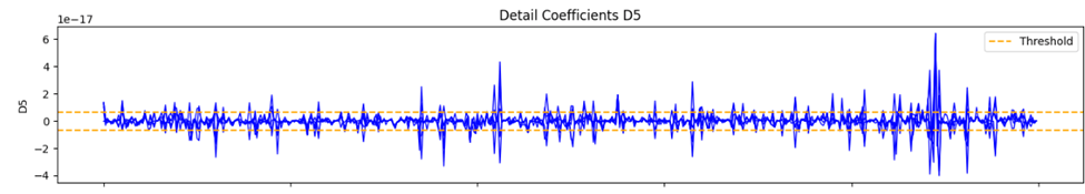 Step 2: Wavelet decomposition, where we applied the Discrete Wavelet Transform to the log returns using the Daubechies-4 wavelet. We obtained approximation ![]()