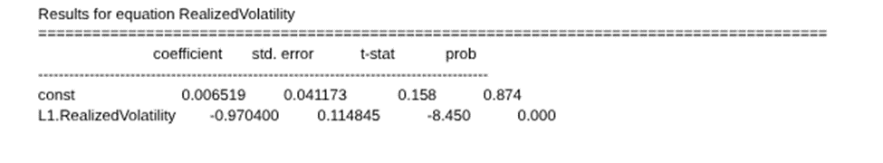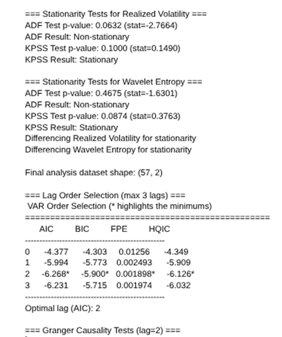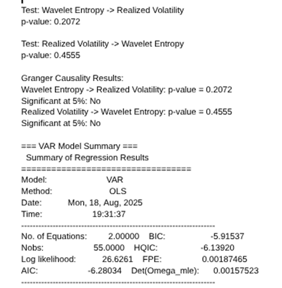 - No statistically significant Granger causality was found between wavelet entropy and realized volatility for this dataset and lag selection. This suggests that in this specific period, past values of wavelet entropy do not predict realized volatility beyond what past volatility already explains, and vice versa.