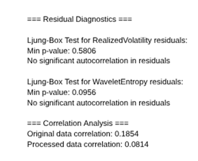 - Ljung-Box test shows no significant autocorrelation in residuals for both Realized Volatility and Wavelet Entropy models.