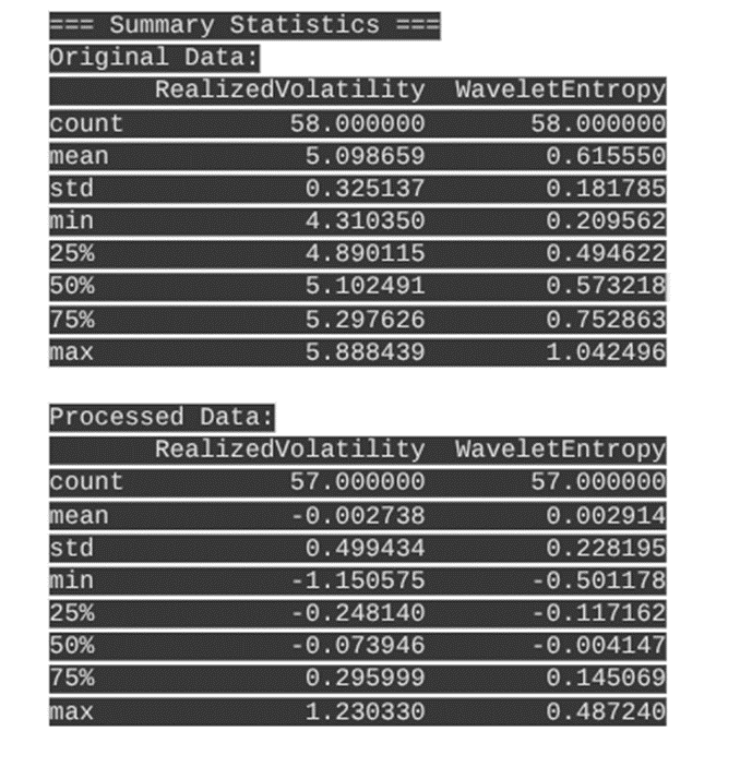 - Final dataset after differencing has 57 observations and 2 variables (Realized Volatility and Wavelet Entropy).
