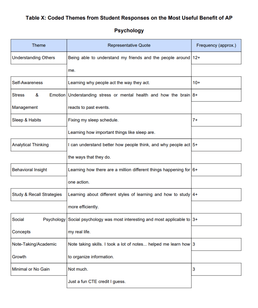 This study offers a student-centered view of AP Psychology’s value, showing that many students perceive it as a course that helps them understand themselves and others while developing life skills. While further research is needed to confirm these benefits objectively, these findings suggest that psychology education at the high school level may play an important role in supporting both academic and personal growth.