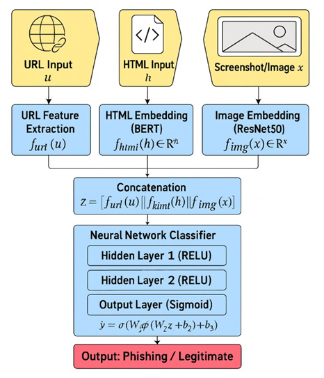 To overcome these limitations, we introduce Phisher, a multimodal phishing detection framework that integrates three complementary modalities: textual, visual, and URL-based. Each modality contributes distinct representational power—BERT-based embeddings for semantic context, ResNet50-based embeddings for visual patterns, and handcrafted URL features for structural signals. These are later combined into a unified feature vector for binary classification (phishing vs. legitimate). Figure 1 provides an overview of the architecture.