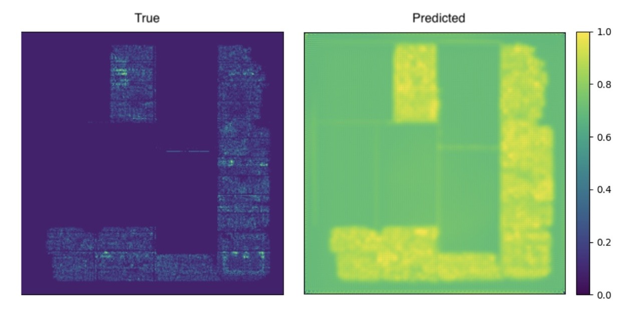 The autoencoder architecture performed the worst because it is primarily designed for dimensionality reduction and reconstruction tasks rather than sophisticated feature extraction or classification. Autoencoders generally lack the specialized mechanisms, such as attention layers or feature hierarchies, needed to identify and classify intricate patterns like IC chip congestion. Additionally, autoencoders compress information into a latent space, often losing critical spatial details necessary for this application. As a result, the autoencoder struggled, as shown in Table 2, only achieving a 1-SSIM score of 0.351 ± 0.018 on the test dataset. As shown in Figure 7, the training quickly plateaued, and the prediction lacks similarity to the ground truth, as shown in Figure 8.