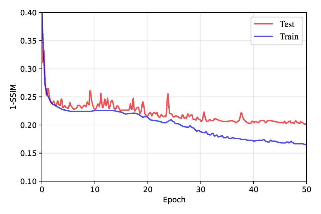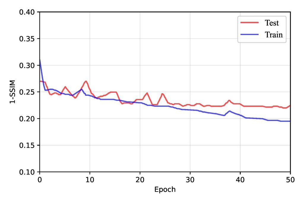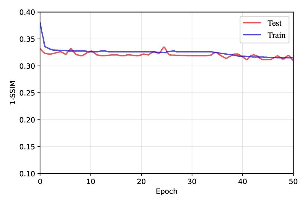 As training progressed beyond the early epochs, the rate of improvement in loss metrics slowed but continued to decline steadily up to around the 30th epoch. However, after approximately 30 epochs, the model began to exhibit signs of overfitting. The training loss continued to decrease, but the test loss plateaued and occasionally increased. This shift suggested that the FPN had started to memorize the training data rather than generalizing it to unseen samples. Overfitting was further reflected in the slight degradation of SSIM and BCE loss metrics on testing data, as shown in Figure 13, emphasizing the importance of implementing strategies such as early stopping, regularization, or data augmentation to mitigate overfitting and enhance generalization. Overall, this training behavior underscored the FPN’s capability to learn progressively while revealing the challenges of balancing model complexity and generalization.