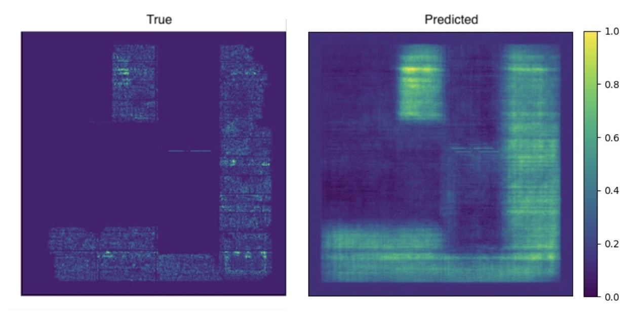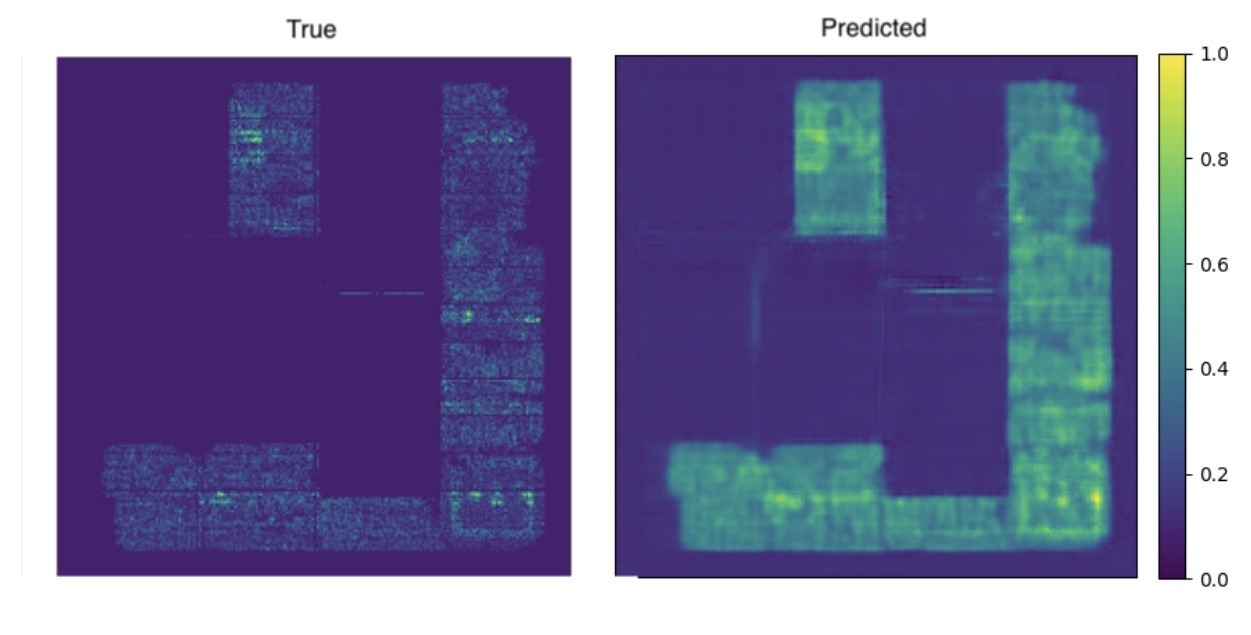 The model preserves local edges near macros better than the autoencoder. Skip connections help retain fine detail and reduce the loss of contrast at block boundaries. The model continues to struggle with local structures however. When congestion lifts broadly without sharp boundaries, predictions overstate widespread demand.