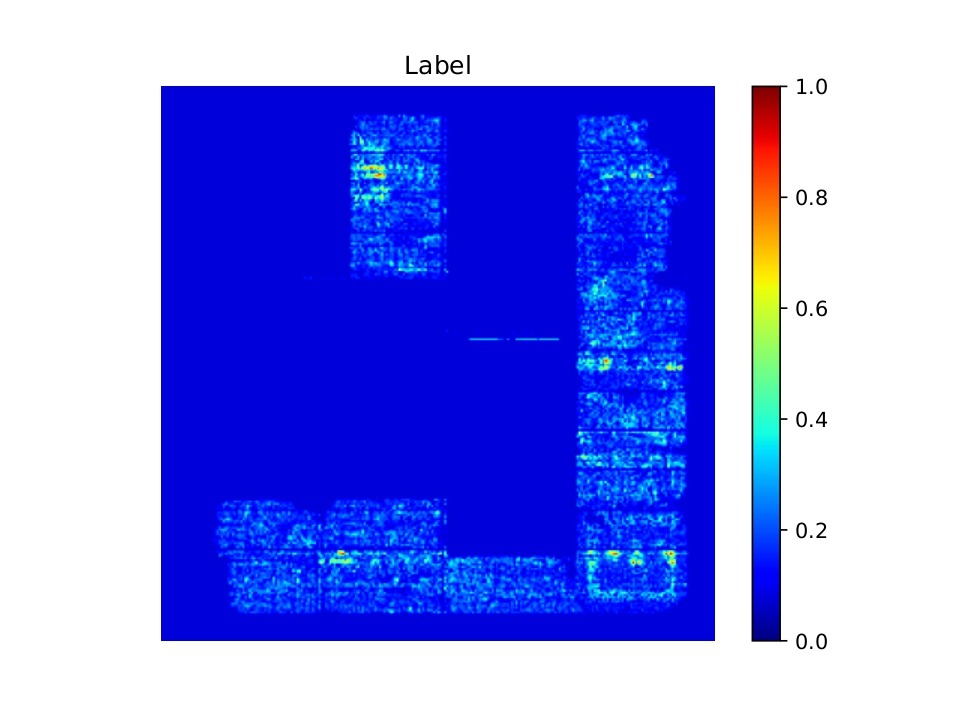 We used an open-source dataset named CircuitNet-N287. It contains 10,370 samples with three early-placement inputs each: Macro Regions, RUDY, and RUDY_PIN. Each is at 256×256 resolution and stacked as a 3-channel tensor as shown in Figure 1. The target is a 256×256 congestion map as shown in Figure 2.