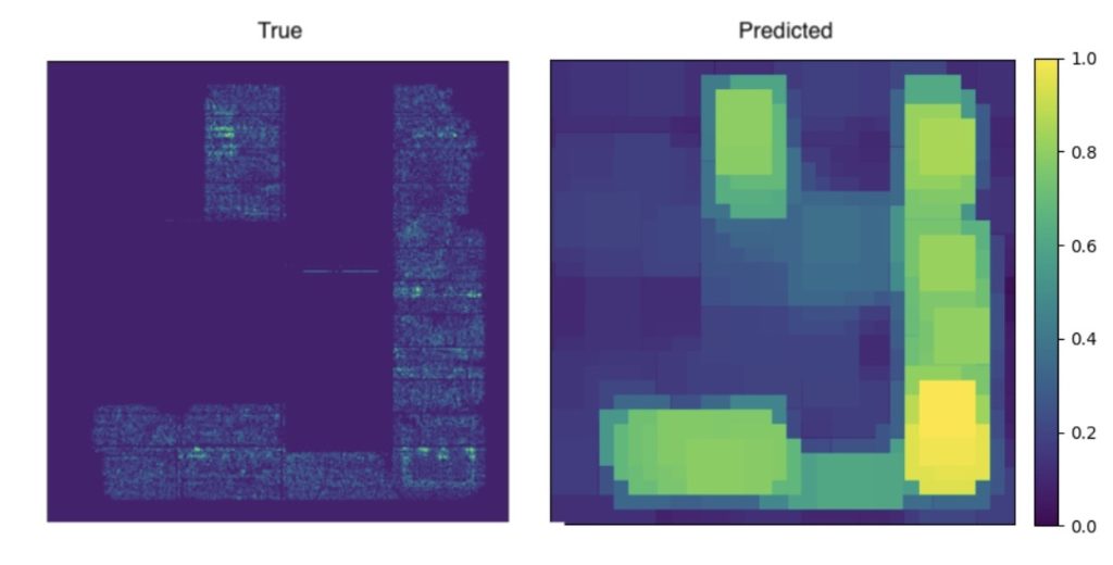 ViT does an excellent job of capturing broad congestion lifts across large regions. It models long-range coupling between distant macros and follows coarse RUDY trends across the floorplan. Diffuse hotspots U-Net failed to identify are usually identified with the correct shape and rank.