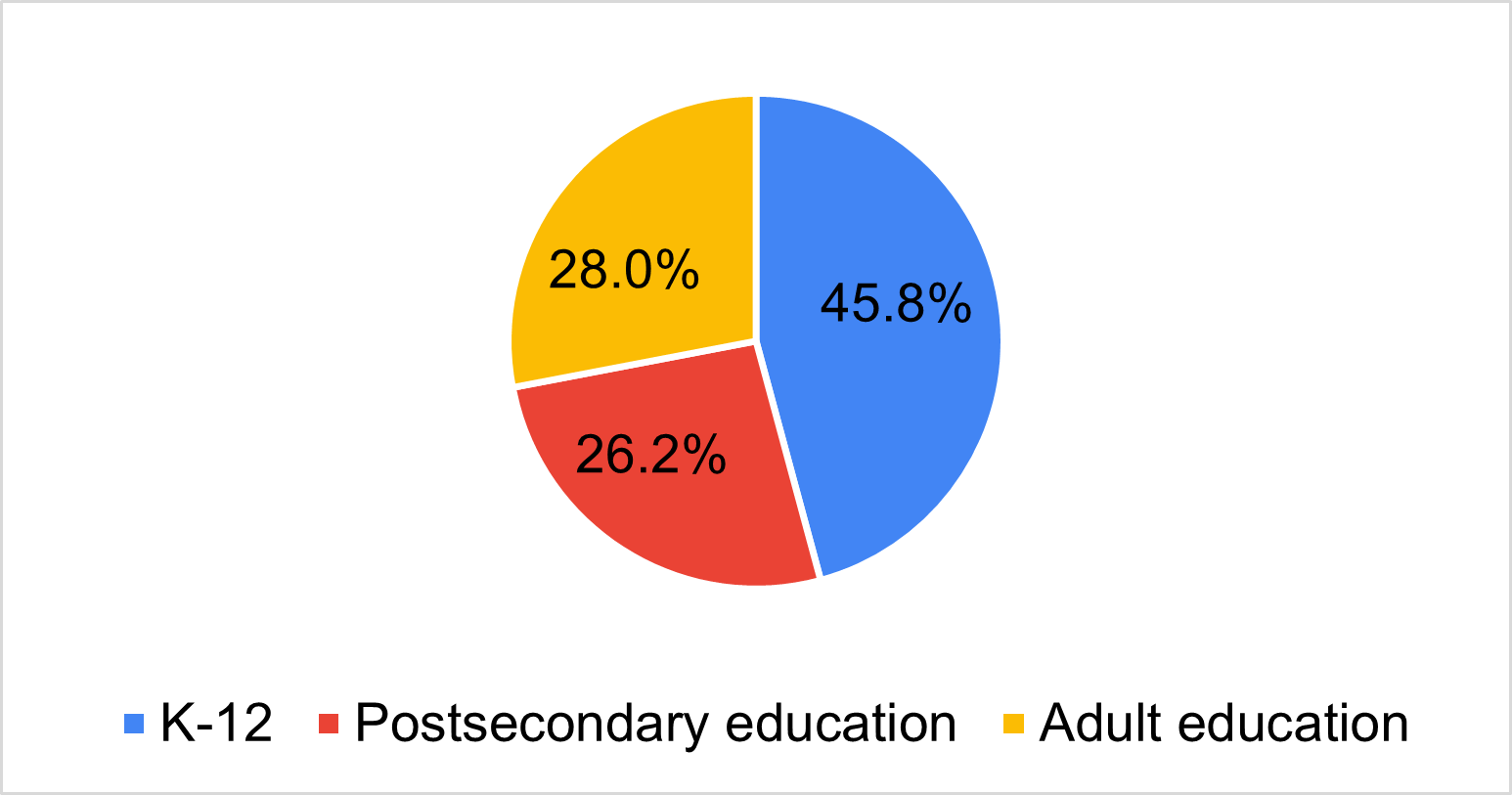 Figure 10 shows the distribution of sampled programs by target education level: 45.8% target K–12, 26.2% target postsecondary education, and 28.0% target adult education. While this aligns with the intuition that more programs focus on K-12, these proportions should not be interpreted as representative of the overall SEL program landscape. The true distribution is likely more skewed toward K-12, as we intentionally sampled a balanced number of postsecondary and adult education programs to ensure broad coverage. Nevertheless, the presence of a substantial number of programs for postsecondary reducation and adult education demonstrates that SEL is not exclusive to K-12, even if it is most commonly discussed in that context.