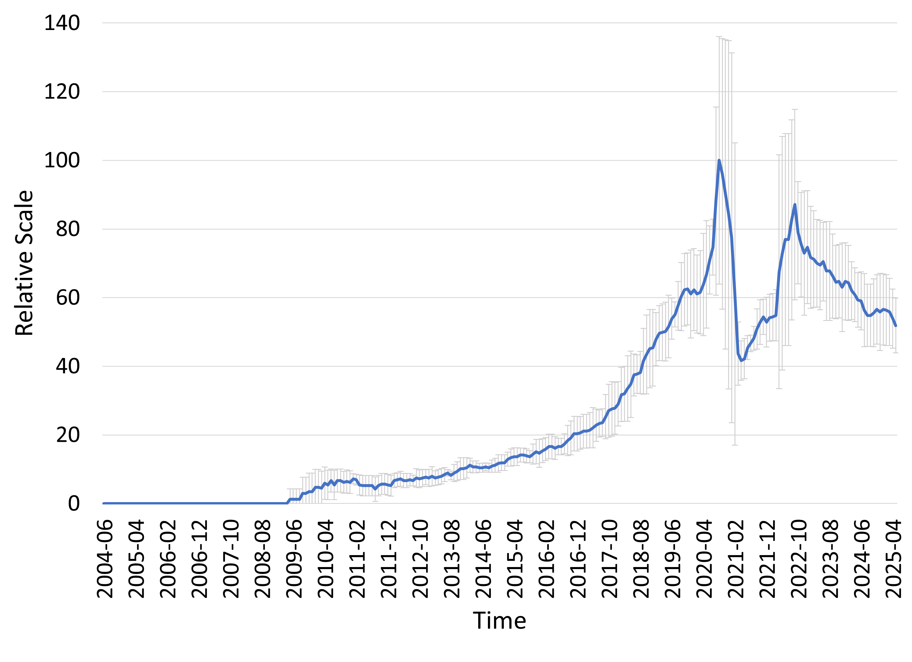 Google Trends properly filters and normalizes the data. First, if the same keyword is searched repeatedly by a person or bot within a short timeframe, it is counted only once. Second, a keyword’s search frequency is normalized relative to the total search volume. Therefore, if a topic is not gaining popularity but its search volume increases merely due to a growing internet user base, Google Trends will show the frequency as flat rather than increasing. In addition to tracking the evolution of a keyword’s search frequency over time, Google Trends can also compare multiple keywords to indicate which is more popular during a given period.