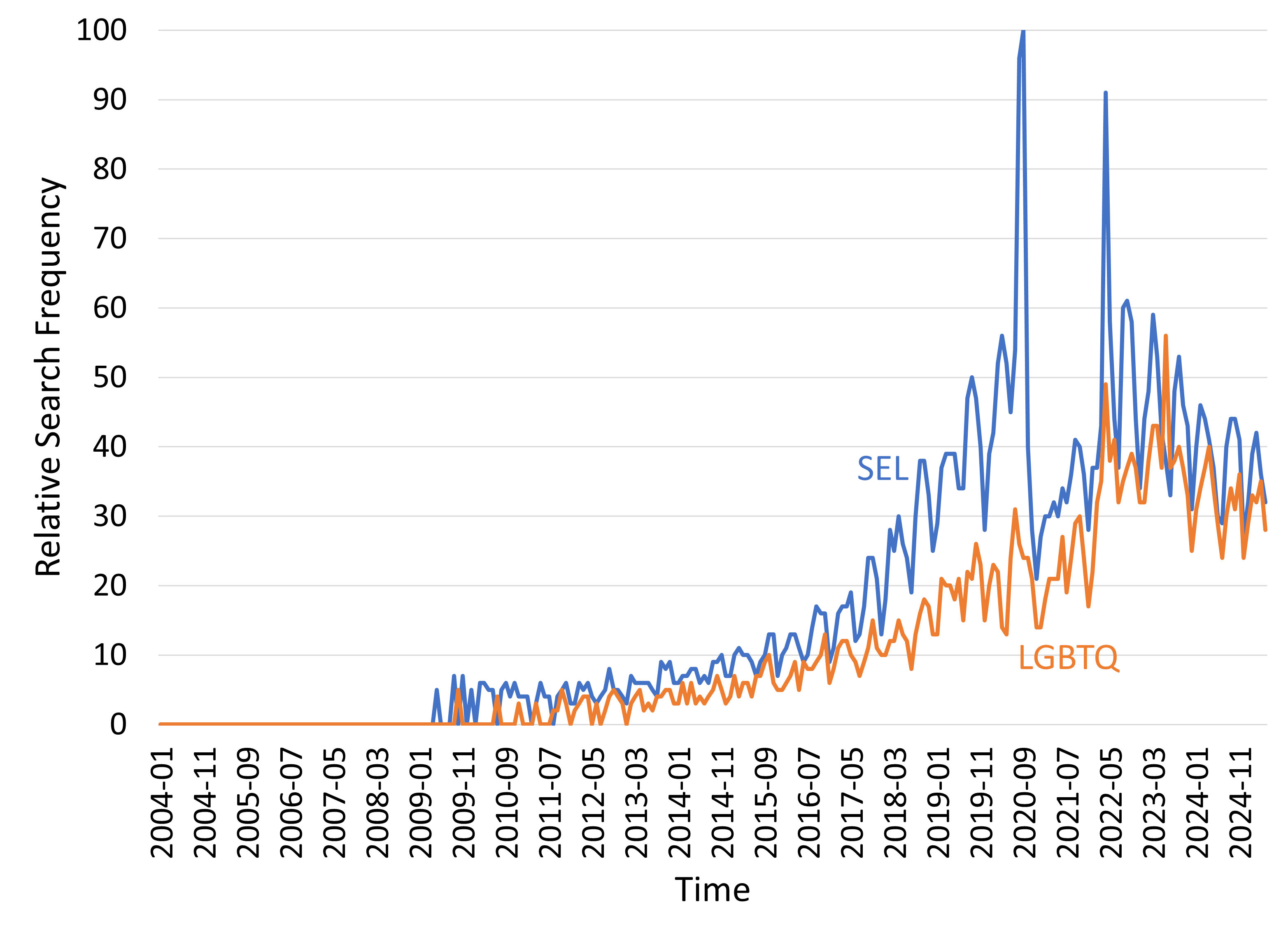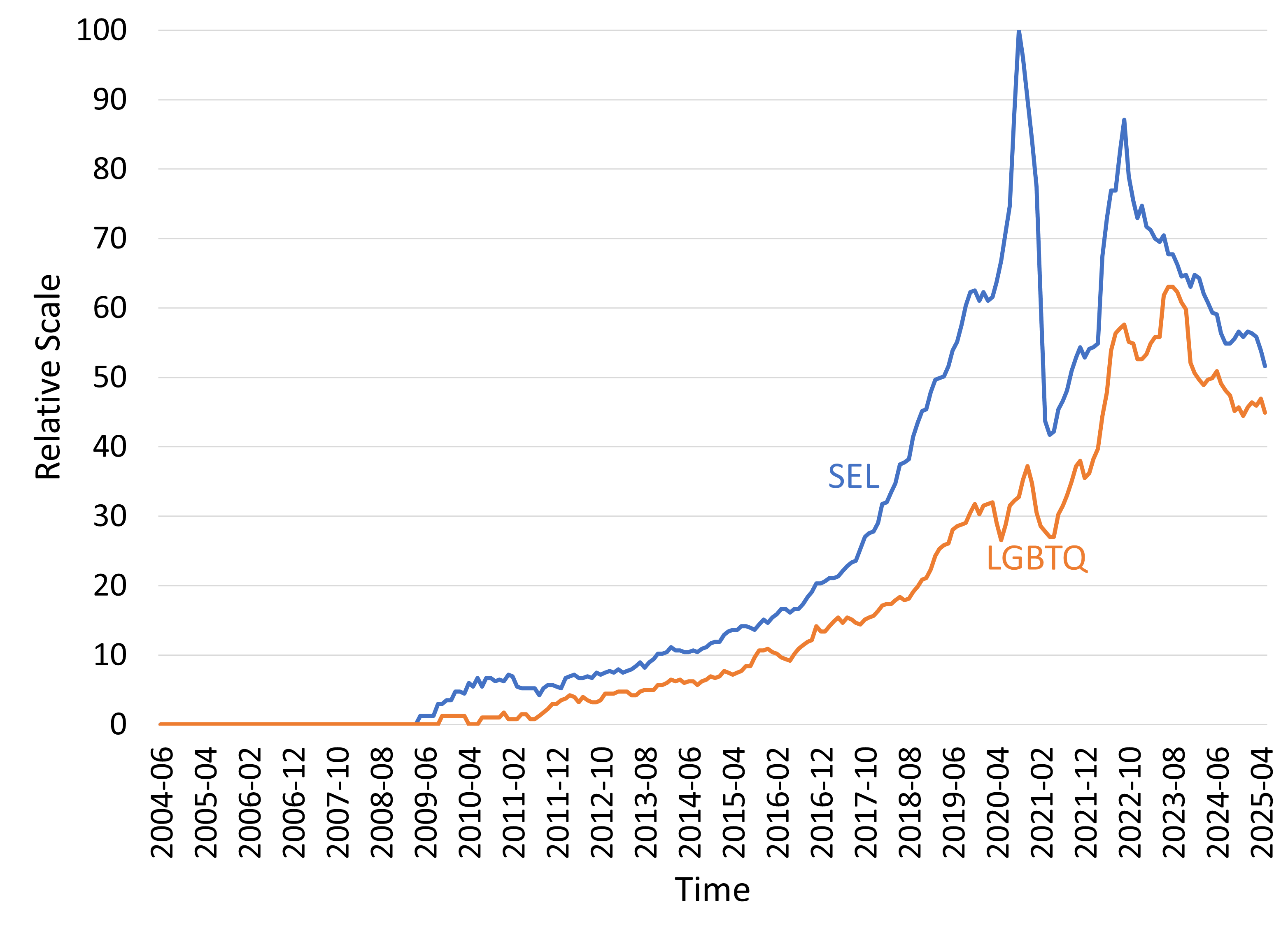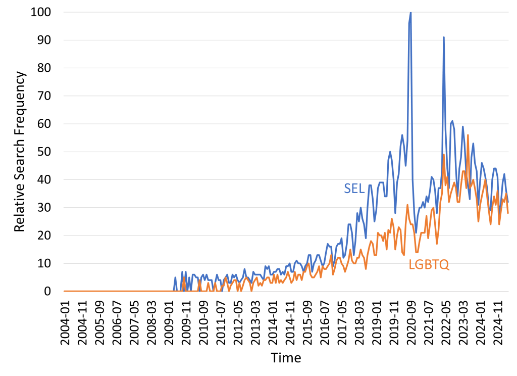 Second, even if search frequency reflects public interest, it does not distinguish between “positive” and “negative” interest. For example, after COVID-19, search frequency for SEL and LGBTQ topics declined sharply, while searches for DEI increased—likely not entirely driven by positive attention.