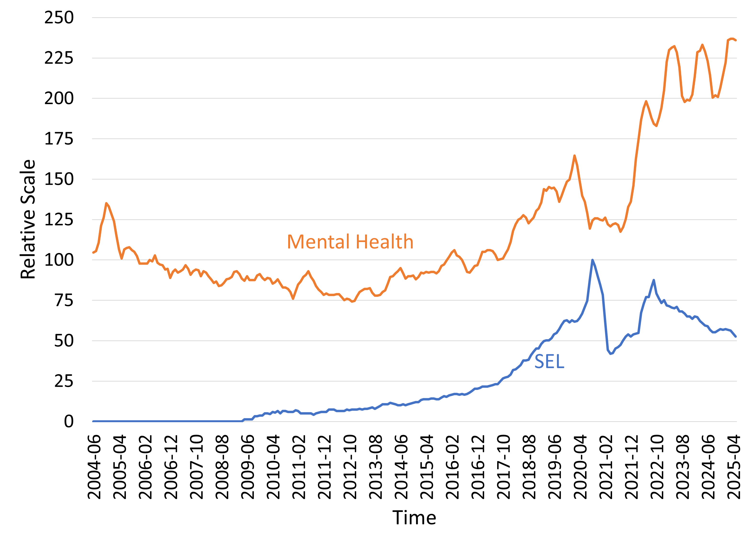 - Finally, post-COVID-19, the search frequency for SEL has steadily declined to a level approximately 40% lower than before the pandemic. One hypothesis is that public interest has shifted toward other topics, such as long-term mental health challenges following COVID-19, as shown in Figure 3. Additionally, the broader political climate has grown increasingly critical of DEI, which is often perceived as linked to SEL, potentially contributing further to the decline.