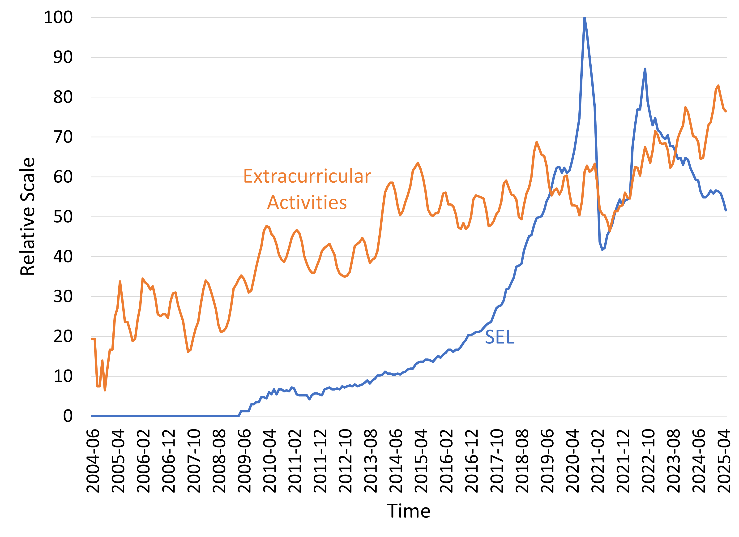 - Over the past two decades, how has public interest in SEL evolved, and how does this trajectory compare to that of other non-academic educational topics, such as mental health, extracurricular activities, and DEI?