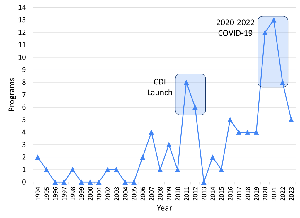 - Establishment of SEL programs: Before COVID-19, the number of new SEL programs grew steadily, mirroring rising public interest in SEL. A period of rapid growth appears to coincide with the 2011 launch of CASEL’s Collaborating Districts Initiative (CDI), which promotes systemic SEL implementation in large urban school districts. During the pandemic, there was a notable surge in program establishment in 2020 and 2021. Post-pandemic, however, the creation of new SEL programs has returned to pre-pandemic levels, correlating with the broader decline in public interest.