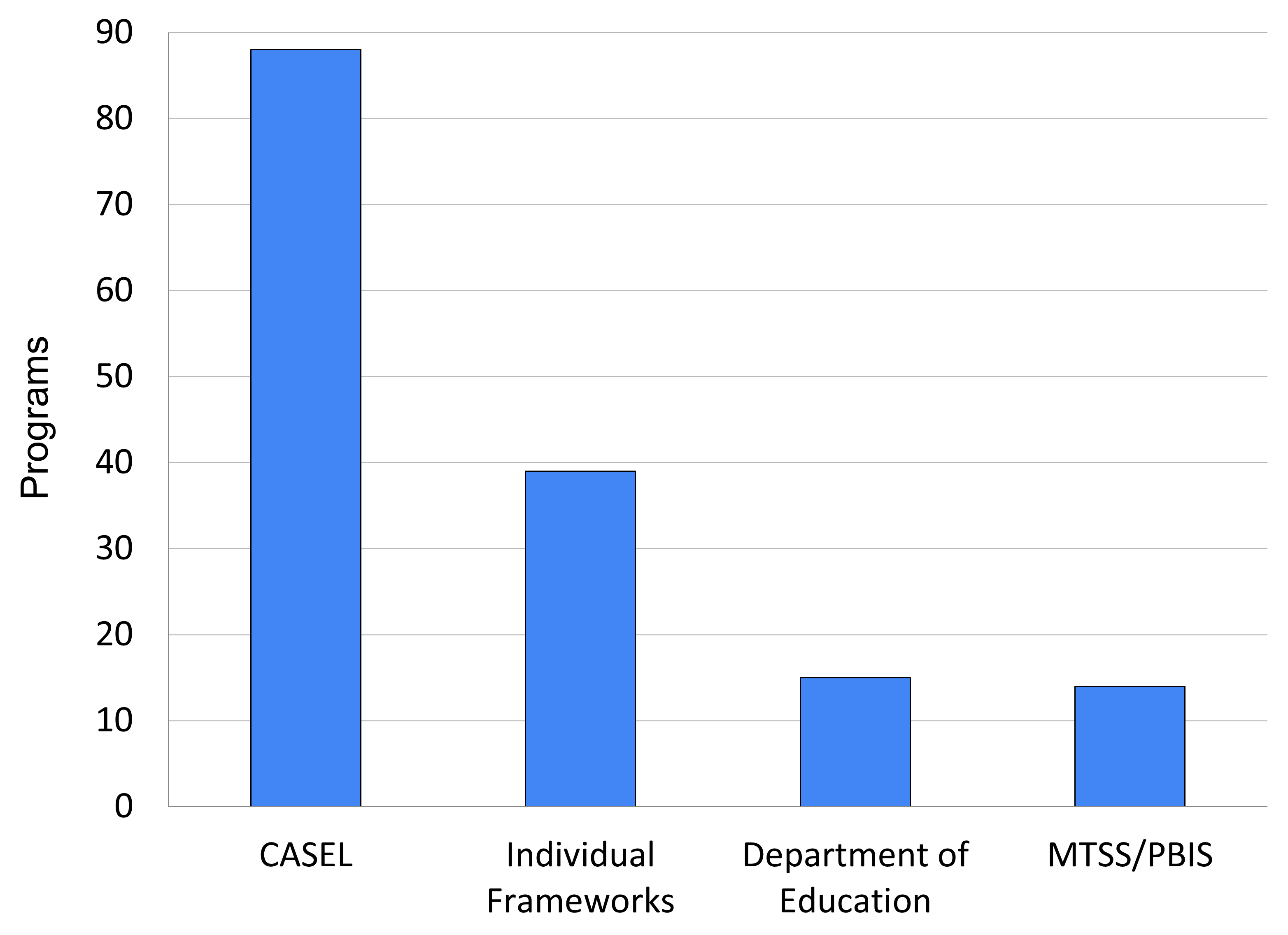 Our study compares the adoption of different frameworks across the 115 sampled SEL programs and finds that the CASEL framework is the most widely adopted.