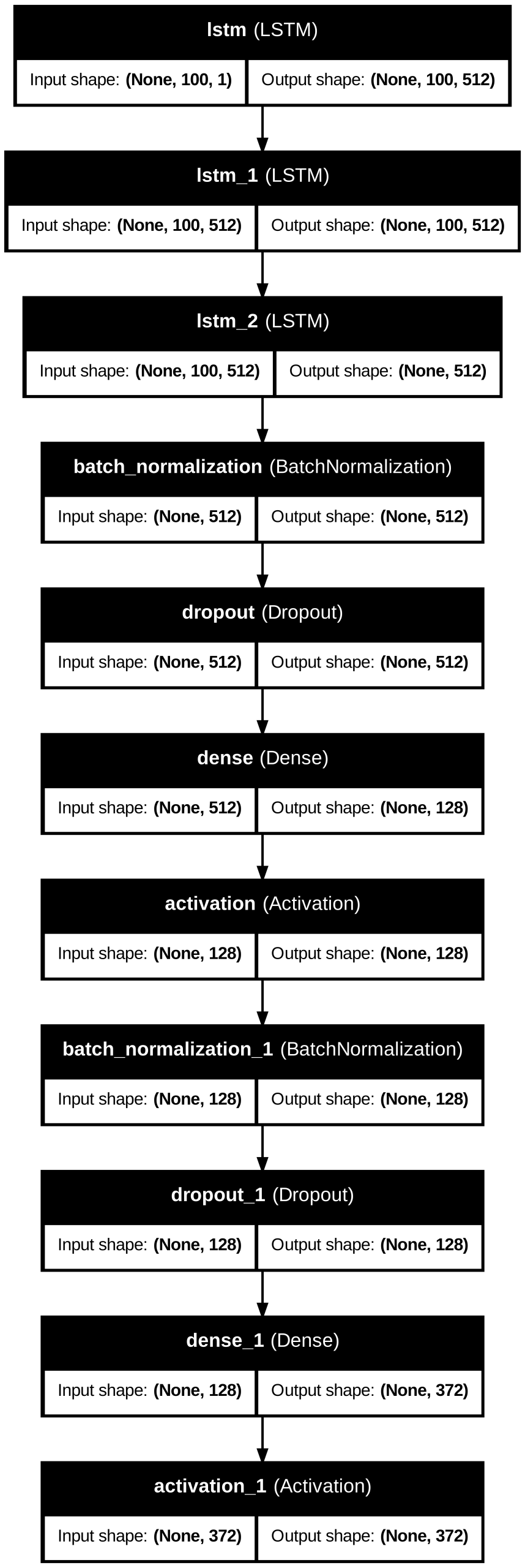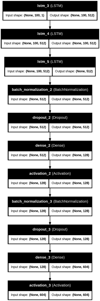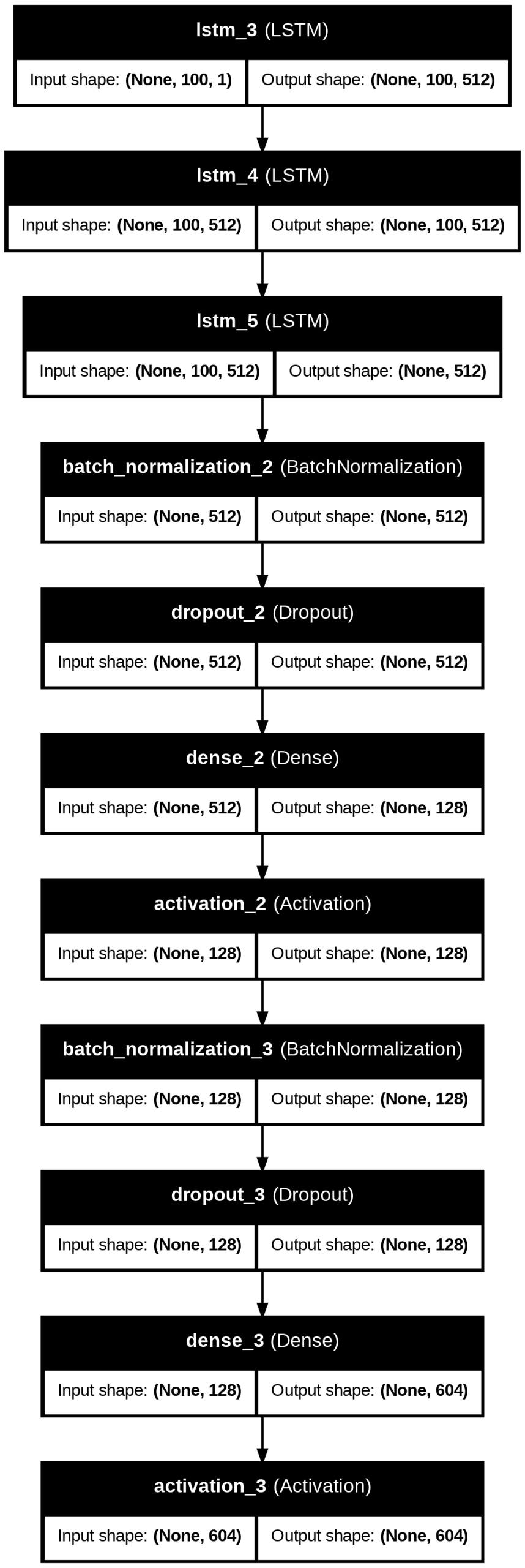 The LSTM Generation model follows this architecture as noted in Figures 18 and 20. The first three LSTM layers have 512 hidden units initially capturing note features, with recurrent dropout=0.3 for the first two. There is a Batch Normalization layer, then a Dropout layer with dropout=0.3 to minimize overfitting. An additional Dense layer with 128 units is followed by a ReLU activation function. Then another Batch Normalization and Dropout layer is used. A Dense layer with 372 or 604 units, corresponding to note vocabulary size, outputs a probability distribution over all the possible notes. The output layer finally uses a softmax activation function.
