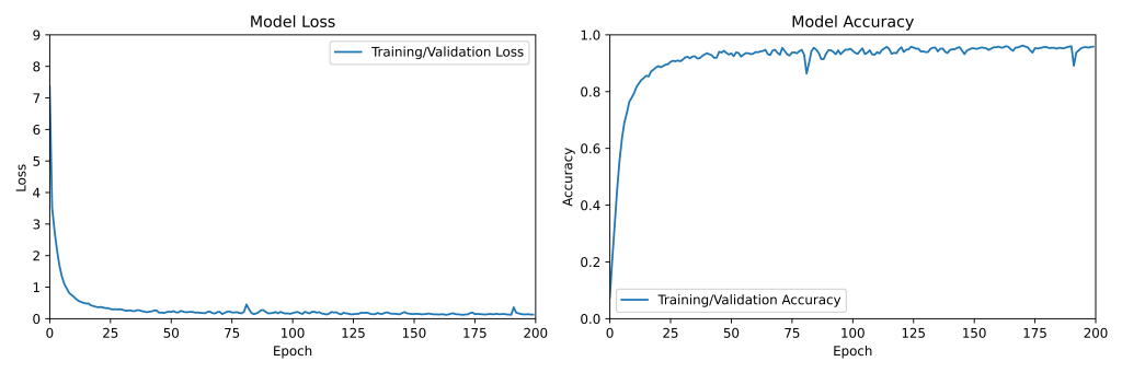 For training of the music classifier, Figure 1 shows that the LSTM model improved at around 25 epochs, reaching an accuracy of approximately 90% and at 200 epochs, 96% accuracy (Figure 1). On the other hand, the Transformer model required a few epochs to reach an accuracy of around 80% and remained similar at 100 epochs (Figure 2). This also indicates that the Transformer required around 1/7 of the time of LSTM generation models for training (Table 1), suggesting that it was far more time-efficient than the LSTM model for training. During training, both models utilized around half of the allotted VRAM or less, with almost no CPU usage. However, the LSTM model achieved a better training accuracy than the Transformer model (Figure 3), and thus, it produced a better classifier overall for Classical and Jazz classification.