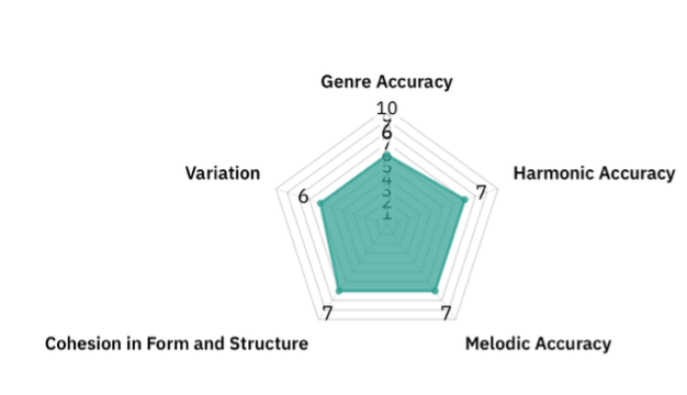 Finally, we also conducted a subjective analysis of 10 representative generated classical/jazz music files for the LSTM and Transformer models based on 5 features: Genre Accuracy, Harmonic Accuracy, Melodic Accuracy, Cohesion in Form and Structure, and Variation. Although mentioned as a possible evaluation criterion in a previous paper8, rhythmic nuance was not analyzed. This was because only pitch was considered as a feature during generation, not the duration of notes or start time, meaning exact rhythms may have been inaccurate. Additionally, the playback tempo was adjusted to best fit the character of the music. The analysis was conducted, and each individual feature was rated manually. The rating ranges from 1 to 10, with 10 being the best, and a description and rubric of the features is presented below: