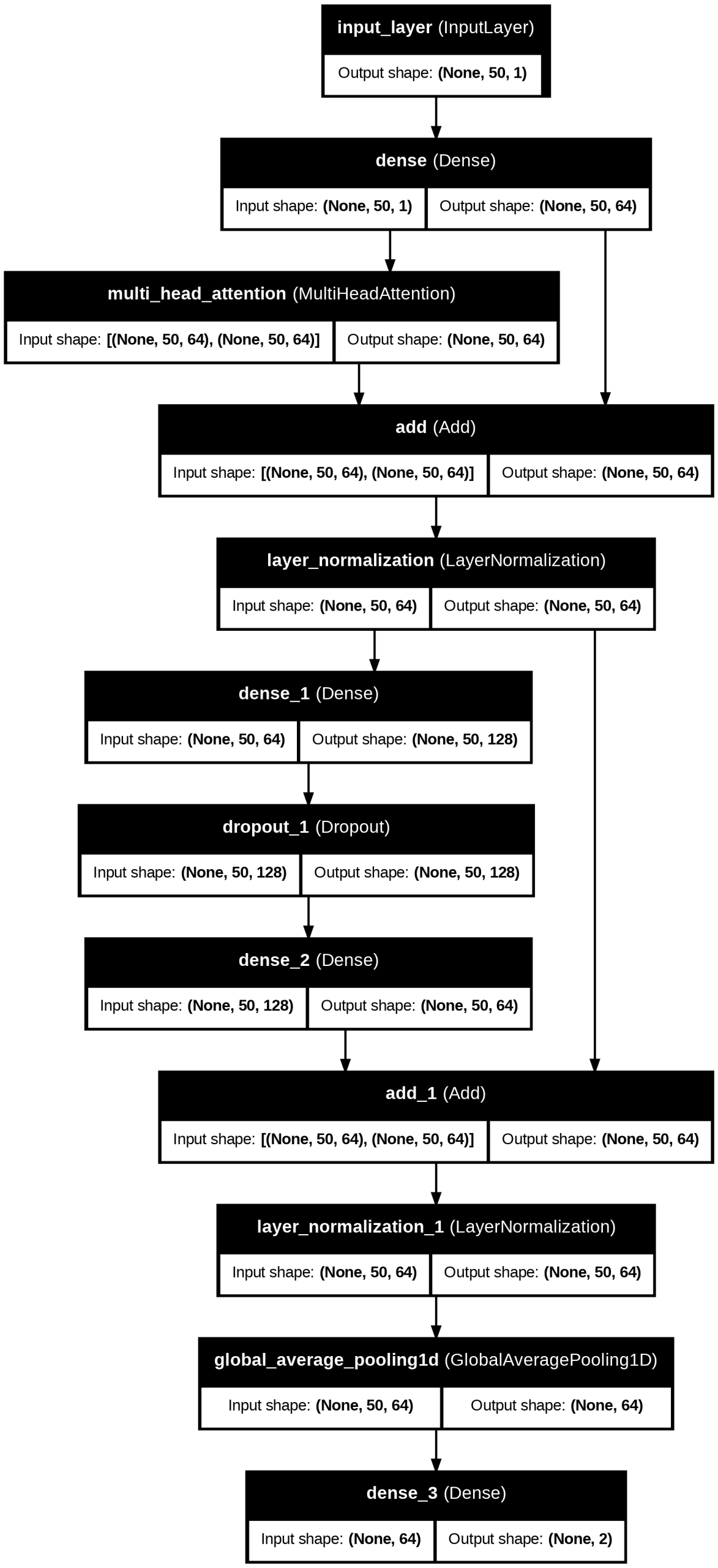 The Transformer Classification model, an encoder-only model, follows the architecture in Figure 17. First, there is a Dense embedding layer with 64 units that transforms input sequences into a higher-dimensional space. Then, the Multi-Head Self-Attention layer, with 64 hidden units and 4 heads, helps capture long-term dependencies in music data. The Layer Normalization layer helps stabilize training by adding the original input to the attention output as a residual connection. In the Feedforward Neural Network, there is a Dense layer with 128 units and a ReLU activation function, a Dropout layer with dropout=0.3 to prevent overfitting, and another Dense layer with 64 units. The Global Average Pooling reduces the output sequence to a fixed-size vector, and the output layer is a Dense layer with 2 units for prediction, using the softmax activation function.