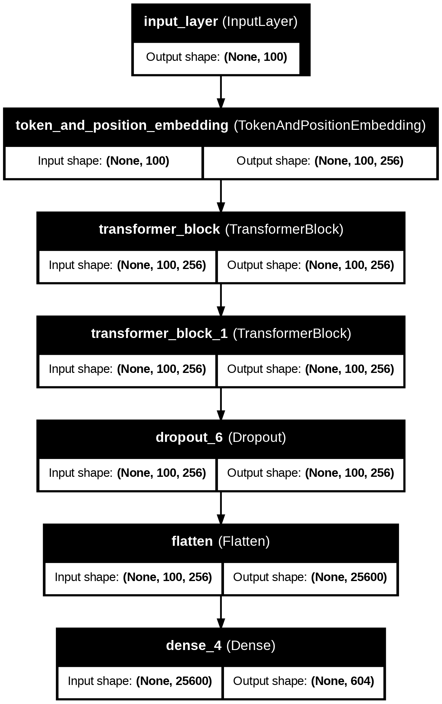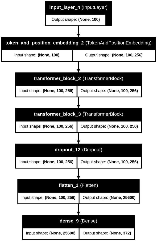 The Transformer Generation model follows this architecture as noted in Figures 19 and 21. An Input layer with a sequence length of 100 tokens transforms input data. The Token and Position Embedding layer outputs a sequence of token embeddings of size 256. The Transformer encoder layers are multi-head self-attention and feedforward networks that capture long-term dependencies. A Dropout layer with dropout=0.3 is included to reduce overfitting. In the Flatten layer, the output is flattened into a 1D vector. Finally, the output layer is an output layer with a softmax activation function over 376 or 604 possible notes.