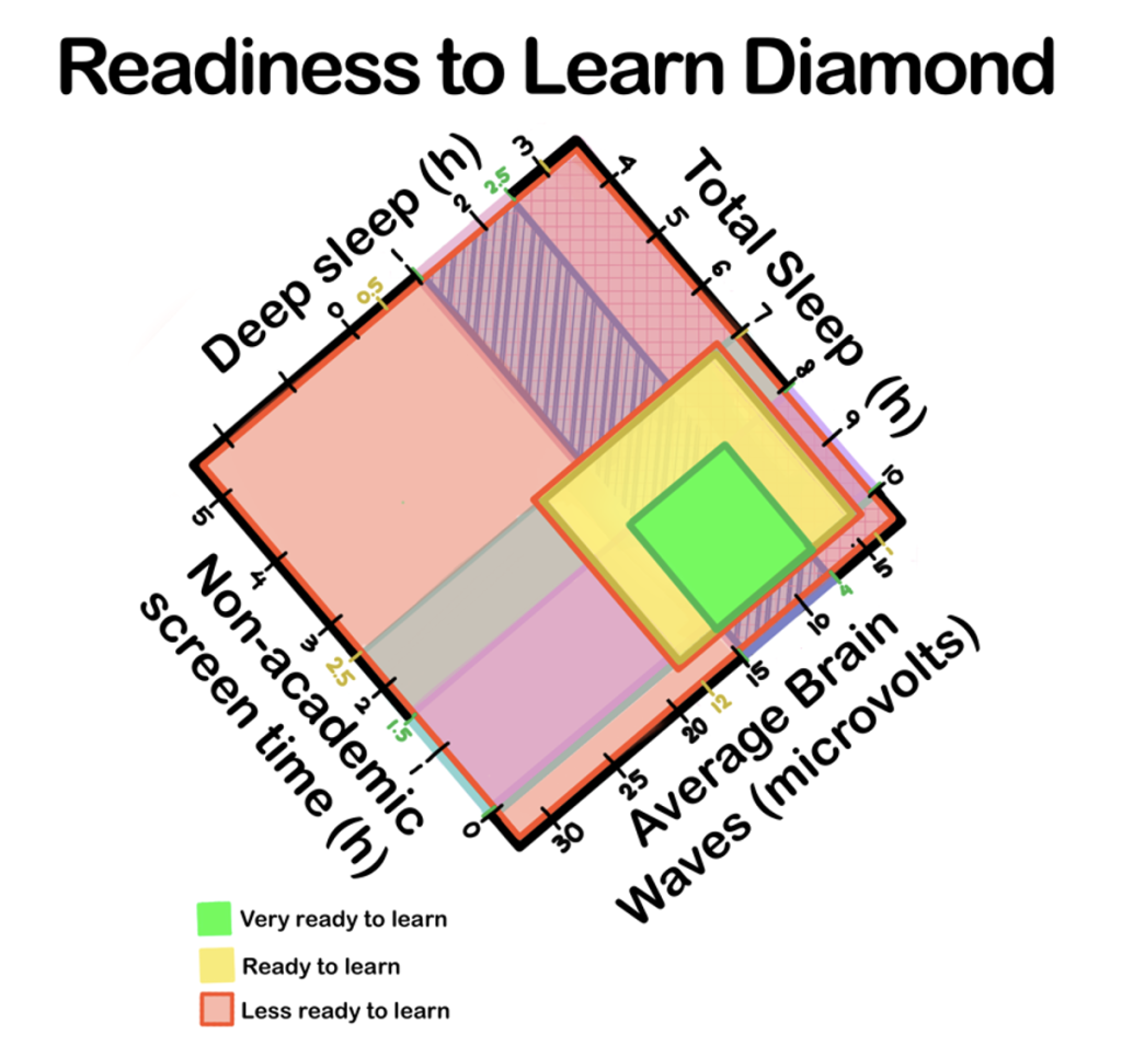 Despite these challenges, the study successfully advances the field by integrating behavioral (sleep, screen time) and biological (EEG) variables into a single, practical framework for measuring readiness—a gap identified in prior research that relied on either questionnaires or isolated biological markers. The proposed “readiness diamond” addresses a critical need for educators and parents: it visualizes four key variables (total sleep, deep sleep, screen time, brain wave amplitude) in a format that can be interpreted in <5 minutes, compared to 20+ minutes for traditional questionnaires. Unlike theoretical models of readiness1, the diamond is actionable: for example, a student with low deep sleep (<1 hour/night) and high screen time (>3 hours/day) can be targeted with specific interventions (e.g., structured bedtime routines, screen-time limits) to improve readiness.