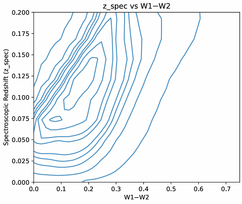 Cluver et al.42 found that since W1 and W2 probe the Rayleigh-Jeans trails of old stars, the W1–W2 color is sensitive to dust and age42. Moreover, Jarret et al.43, Cluver et al.42, and Kauffman44 that the color, W1–W2 is a strong tracer of mass which evolves with time, and that redder values of this color indicate that the galaxy is more massive, dusty, and dimmer, a phenomenon specifically associated with higher redshifts (which explains the 0.5 pearson correlation)45,43,44. Bilicki et al.46,41 and Krakowski et al.47 have found that for machine learning, this color is extremely good for predicting redshift, especially for luminous galaxies for the same reasons46,48,49,50,51
