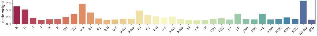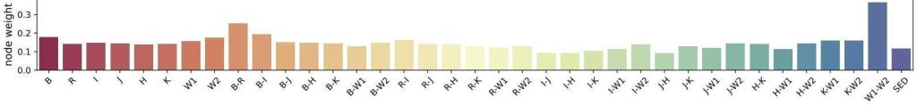 Along with producing better models, we were able to discern which features had the most importance, which can help future studies create even better models by training them on data that is highly focused on these features and discarding the ones with less importance and correlation (Figure 7). We note that they look qualitatively similar, with larger weights assigned to B, (B-R), and (W1–W2). These bar charts help us identify features of less importance, allowing us to discard them in subsequent analyses, to further simplify the models and the input data. The features of high importance are, as expected, since B and W1–W2 are on opposite sides of the spectrum of the different wavebands used, so most of the available information is captured by those filters. In addition, W1 and W2 are filters with very similar pass-through wavelengths, which allows the machine-learning model to pick up the slight brightness differences in that part of the spectrum. Furthermore, the same features that had a high correlation with the first main principal component have some of the highest importance values out of all the features, as seen in the Bottom graph (Figure 7).