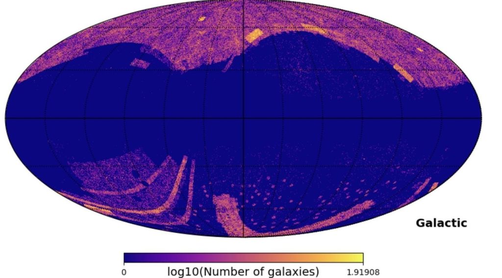Figure 1 | The galactic map. A  map of the galaxies in our dataset minus the galactic mask (A list of the galaxies that lie in our galactic plane, where the blue space represents those galaxies). Using the Healpy library15, we first converted the galactic coordinates of each galaxy to the spherical coordinate system, and then we plotted the galaxies with a certain resolution defined by the pixel count. We use galactic coordinates to showcase the galaxy in the middle of the Figure.