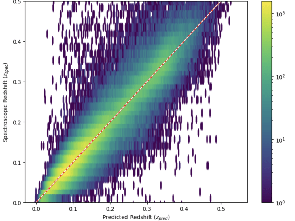 Since major astronomical surveys have been cataloging the universe, the cosmological redshift has been found primarily from the galaxy spectral emission line data (hereafter known as the spectroscopic redshift (spec-z)), which is time-consuming. So spec-z is now typically estimated from the photometric data (e.g., galaxies’ magnitudes, fluxes, colors, spectral energy distributions (SEDs which are graphs of the flux against wavelength for a galaxy), etc)3, which is known as photometric redshift (photo-z)3. Also, with the advancement of machine learning and computational methods, astronomers have started producing photo-z values by either fitting templates or training neural networks on photometric data, and it has been realized in the last decade that machine learning is the way to produce accurate photo-z values efficiently4. Moreover, using machine learning models to estimate redshift benefits cosmological modeling, mapping the universe (especially the distribution of galaxies and dark matter), and aiding future and current surveys, such as the LSST5; Euclid surveys6; SDSS-V7, by efficiently producing accurate photo-z’s. However, it has been shown that neural networks have reached their limits at producing accurate photo-z values and that traditional machine learning methods could pick up where they left off, as shown in the study conducted by Norris et al.8,3,4,9,6,7.