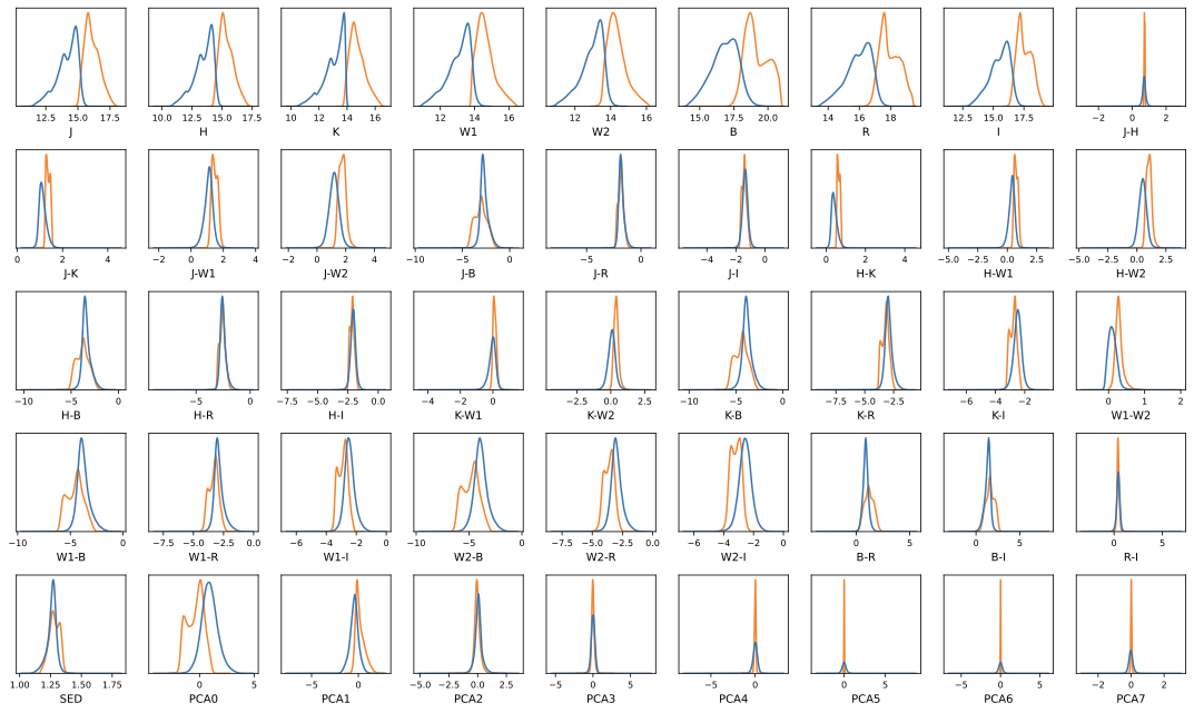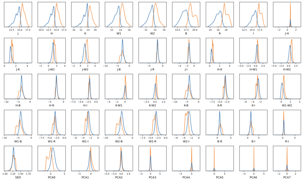 where x is the first feature that is being compared to the second feature y, xi and yi are the ith values of x and y, and ymean and xmean are the mean values of x and y. We determined an appropriate threshold value for Pearson’s correlation coefficient, for which if the absolute value of the correlation coefficient is higher for a certain feature than that threshold, then that feature would be considered an eigenvector of that component19,35. Moreover, from figure 6, we can see that the features that have the most correlation with the first main component (PC_0) are all the colors involving the four magnitudes at the ends of the visible light and infrared spectrums (W1, W2, B, and R) and the colors which involve one of these four magnitudes and one of the middle magnitude (I, J, K, and H). While looking at the features closely correlated with the other principal components, we noticed that the W1–W2, B–R, B, and R features have the highest correlation with all four components, suggesting that they are key features and must have high predictive power with the models. We can also see the colors’ distributions through the two Gaussian KDE plots in Figure 8 36,37,38,34,19,39 (Figures 6 and 8).