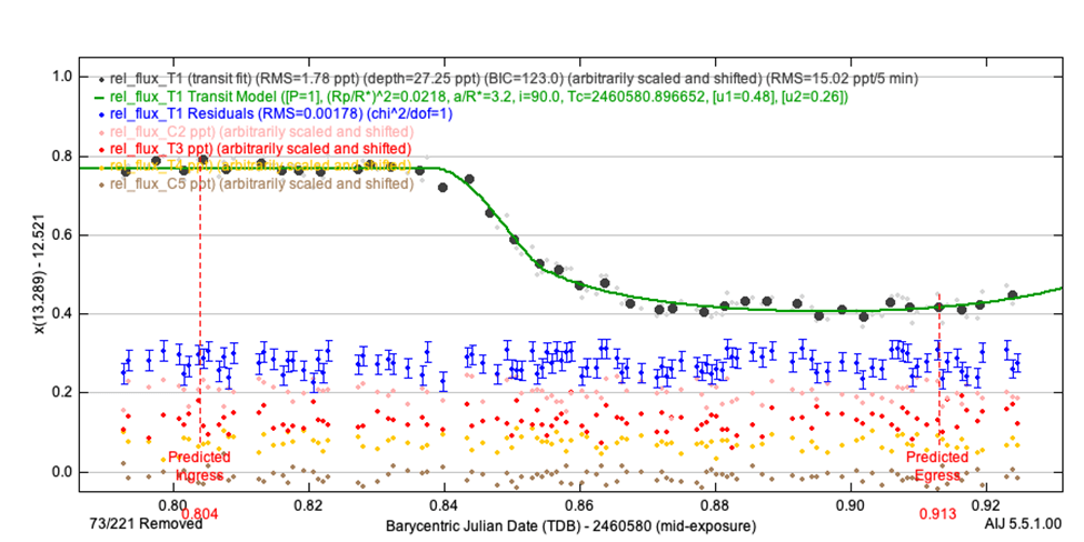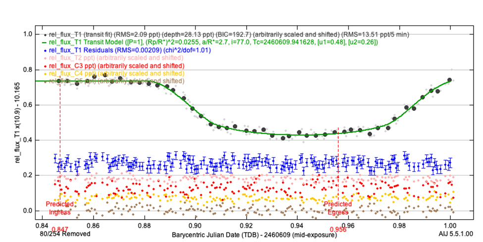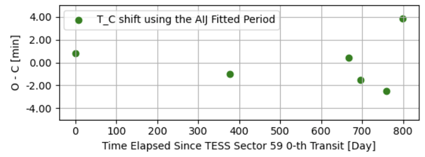 The ground-based telescope clock was examined first and a small 0.5 second drift was identified. This minor drift, however, stayed stable and did not increase significantly over time. The observed transit delay on September 26, 2024 was 54.2 minutes. The clock drift alone could not have accounted for such a big discrepancy. As additional observations were conducted, the observed delay kept increasing (Table 2). However, no corresponding pattern of clock drift was identified. Based on these findings, this hypothesis was rejected.
