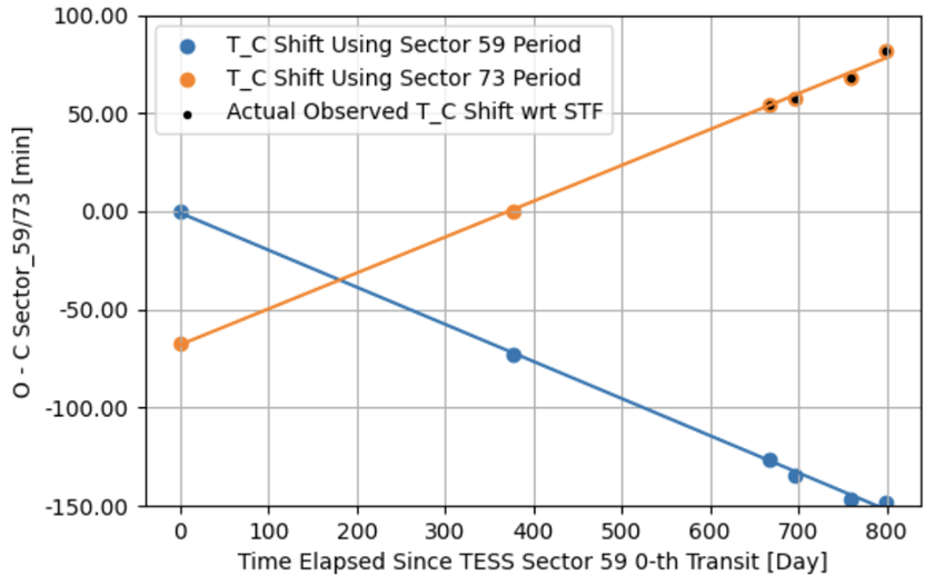 From the above analysis, the delayed transits observed by the ground-based study can be attributed to the inaccurate period reported by TESS 73. Therefore, Hypothesis 2 is confirmed.