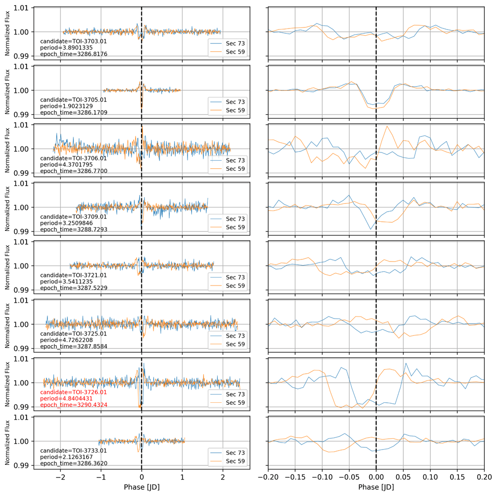 A number of TOIs appearing in both TESS Sector 59 and 73 were selected based on the flux data quality and TIO numbering closeness to TOI-3726.01. Their phase-folded light curves were constructed using the Lightkurve library18. The flux data were outlier-removed (sigma=5), flattened (polyorder=1), normalized, and binned at 0.01 day interval. The folding periods and transit center epochs are shown in Table A-119,20,21,22,23,24,7,25.